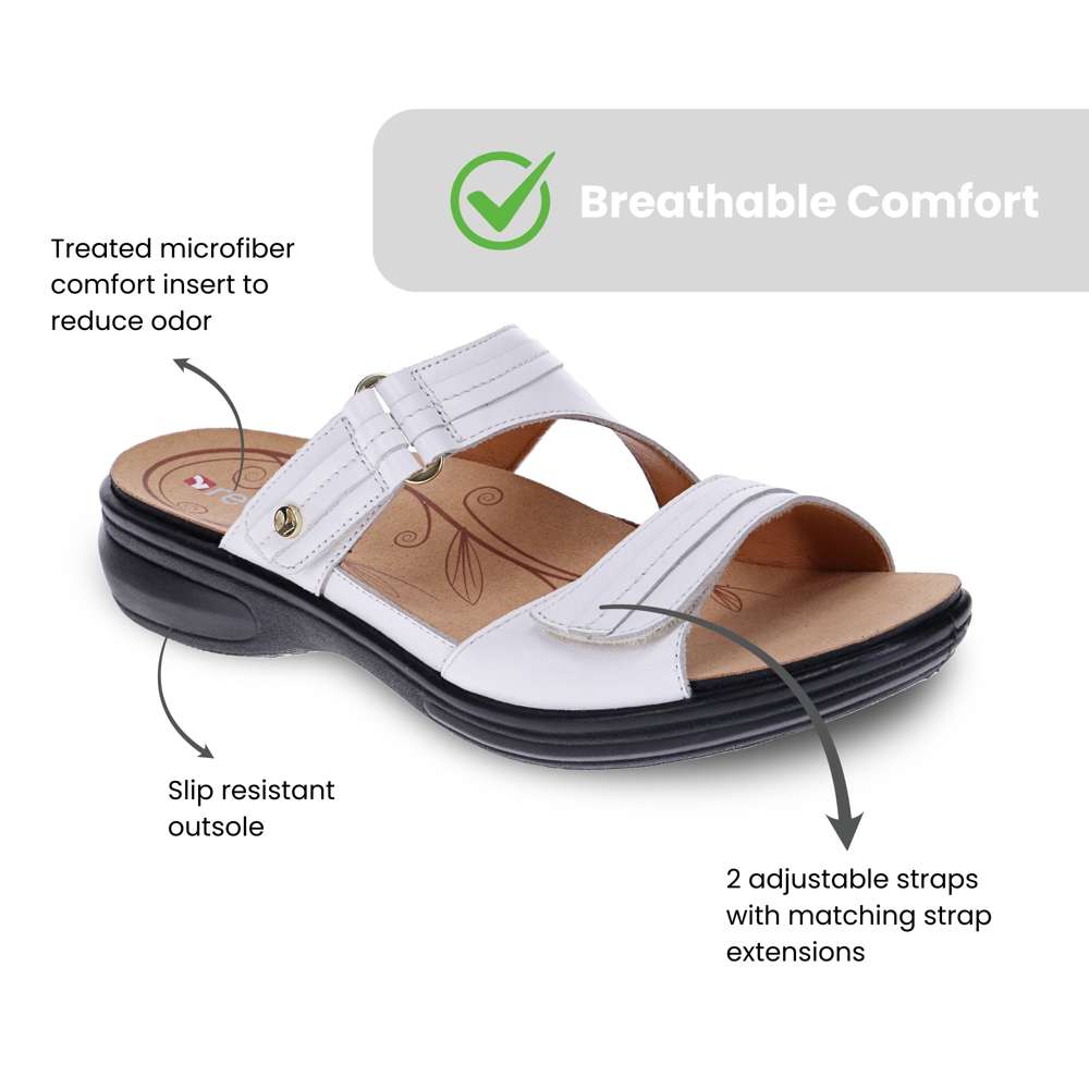 Shiny snake uppers steal the spotlight on Rio, a double-strapped women’s slide sandal with delightful detailing. In vibrant red, deep blue or lustrous black, Rio combines subtle adjustability with metallic accents and textured patent leather. For a look that’s anything but basic, our Rio slides are the best orthotic sandals Australia has to offer.